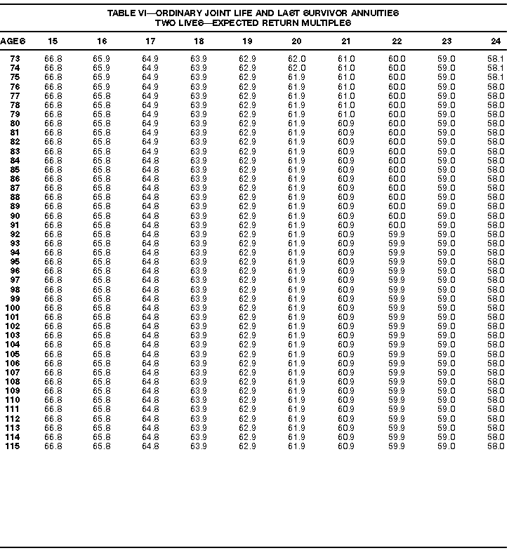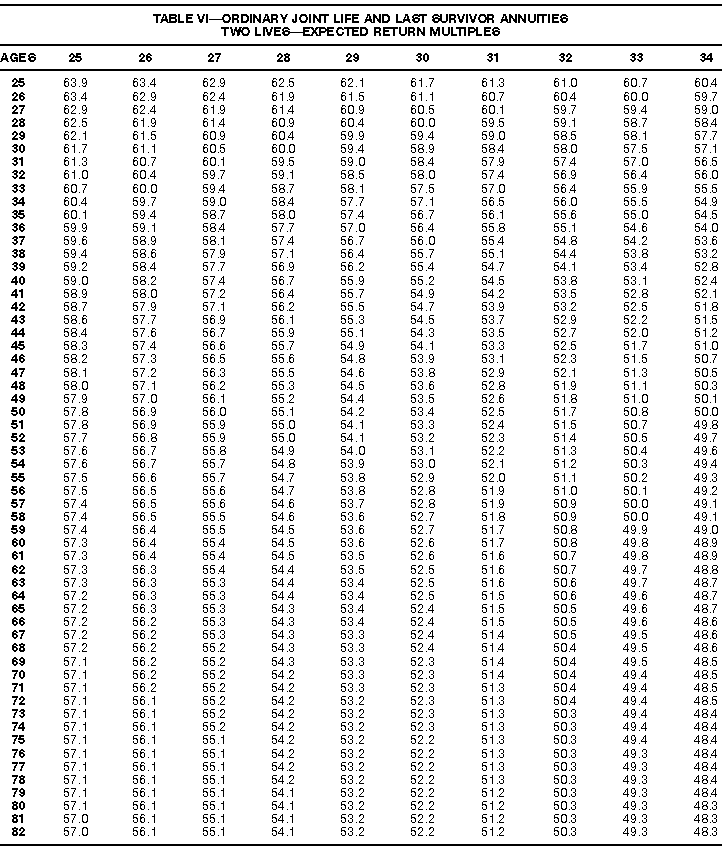 Table VI. Ordinary Joint Life and Last Survivor Annuities - One Life - Expected Return Multiples