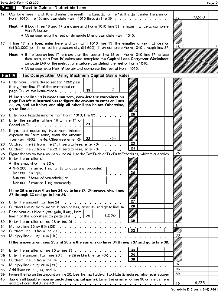 After entering the gain from line 17 on line 13 of her Form 1040, she completes the rest of Form 1040 through line 39. She enters the amount from