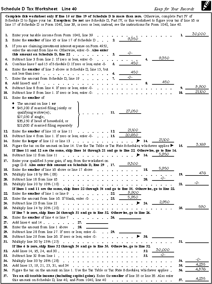 that line, $30,000, on line 1 of the Schedule D Tax Worksheet. After filling out the worksheet and the rest of that worksheet, she figures her tax is