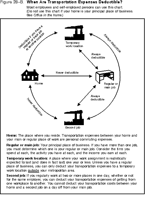 Figure 28-B illustrates the rules for when you can deduct transportation expenses when you have a regular or main job away from