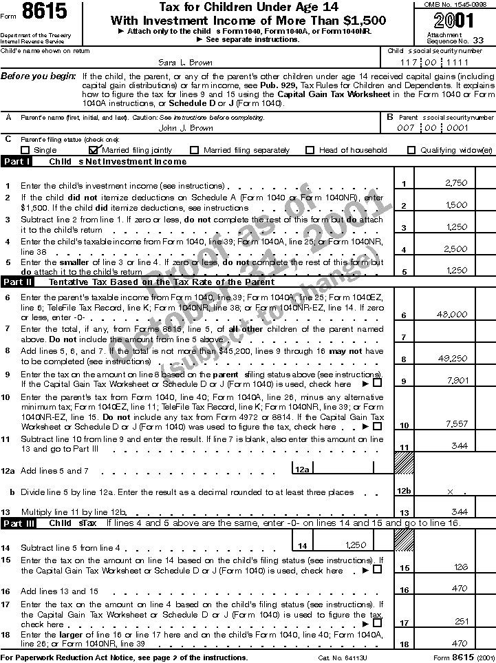 The following example includes a completed Form 8615.