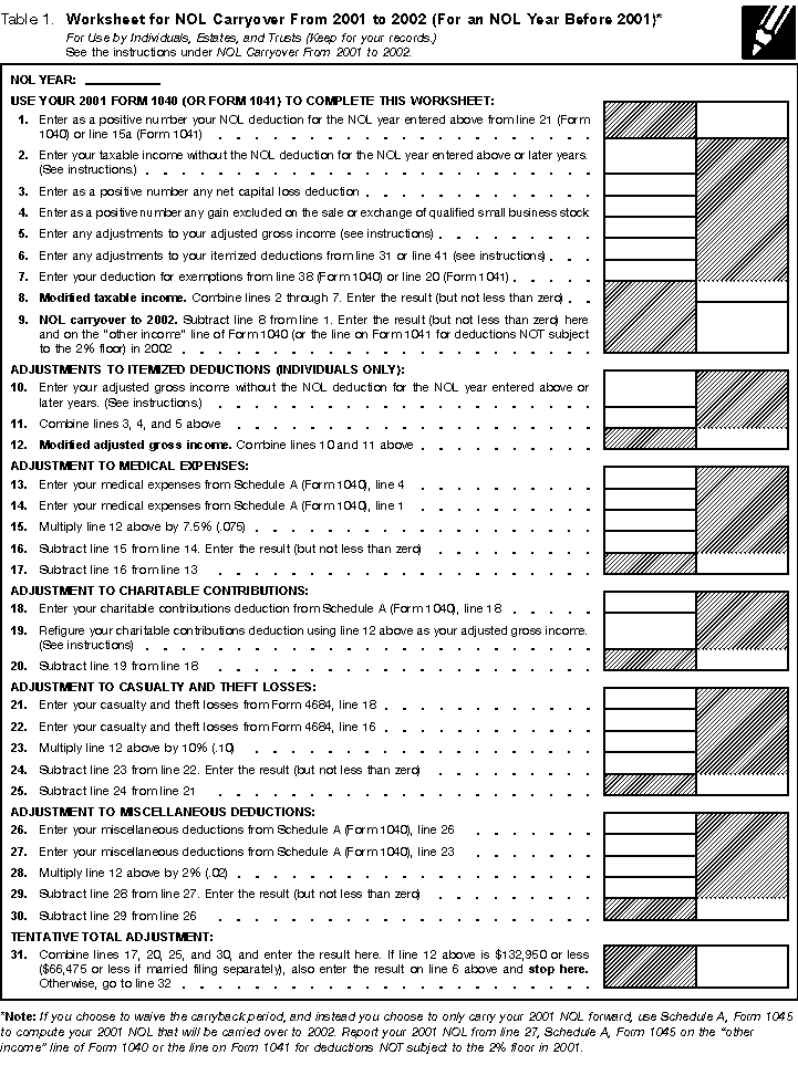 If you had an NOL deduction that reduced your taxable income on your 2002 return to zero (to less than zero, if an estate or trust), complete Table 1, Worksheet for NOL Carryover From 2002 to 2003. It will help you figure your NOL to carry to 2003. Keep the worksheet for your records.