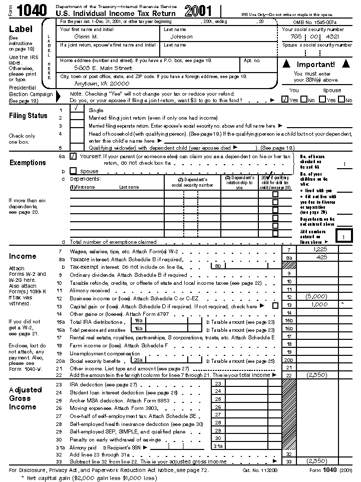 Example. Glenn Johnson is in the retail record business. He is single and has the following income and deductions on his Form 1040 for 2002.