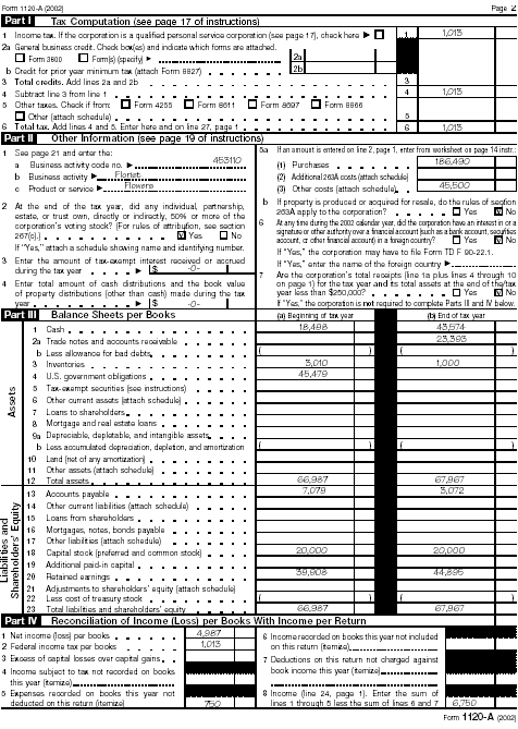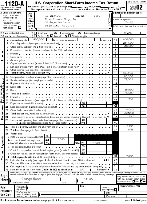 Rose Flower Shop, Inc., is the corporation for which this sample return is filled out. Rose Flower Shop operates a business that sells fresh cut flowers and plants. It uses an accrual method of accounting and files its returns on the calendar tax year basis.