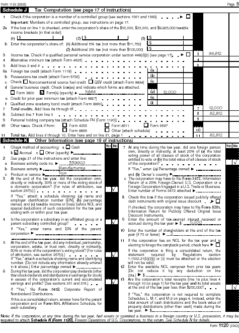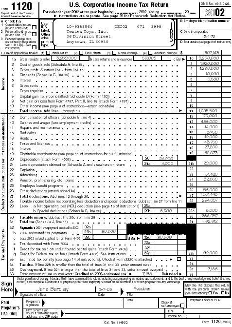 Tentex Toys, Inc., is the corporation for which this sample return is filled out. Tentex manufactures and sells children's toys and games. It uses an accrual method of accounting and files its returns on the calendar tax year basis.
