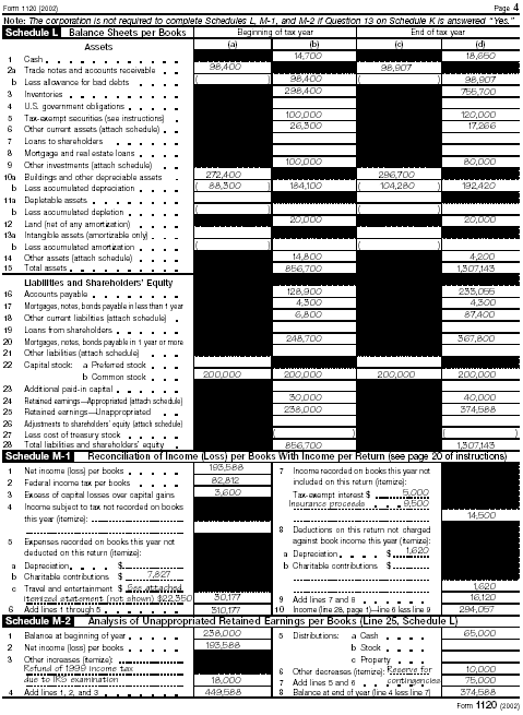 Line 8. $374,588 is Tentex's retained earnings at the end of its tax year. It determined this figure by subtracting the total on line 7 from the total on line 4. This figure must agree with the amount on Schedule L for the end of the tax year.