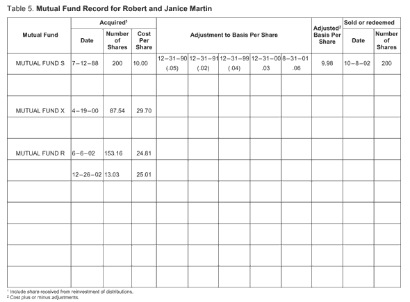 Mutual Fund Record. Robert and Janice keep track of all their basis adjustments on their Mutual Fund Record, shown later. They show the return of capital distributions and the undistributed capital gains from Mutual Fund S and the reinvested dividends from Mutual Fund R. They do not show the exempt-interest dividends from Mutual Fund X because those dividends do not reduce their basis in the shares.