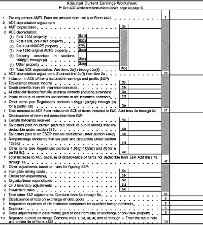 Subtract the ACE expense (if any) from the AMT expense (used to figure line 2m of Form 4626) and enter the result on line 8 of the worksheet. If the ACE expense is more than the AMT amount, enter the result as a negative amount.